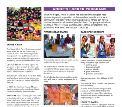 who died in 2007, the idea was born in to do something to inspire people toward a healthier lifestyle. We hope to help people find their “wings.” Annie’s Locker is a non-profit organization that supports people in need of proper fitness gear and provides race scholarships in Rockford, Illinois.